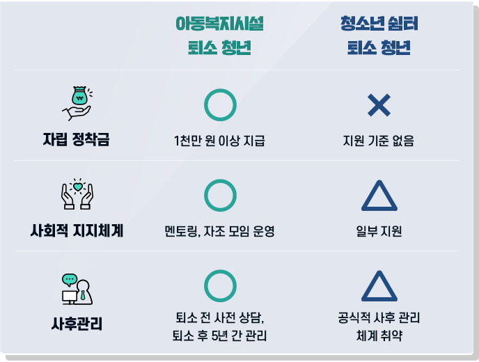 아동복지시설 퇴소 청년 vs 청소년 쉼터 퇴소 청년 지원 비교