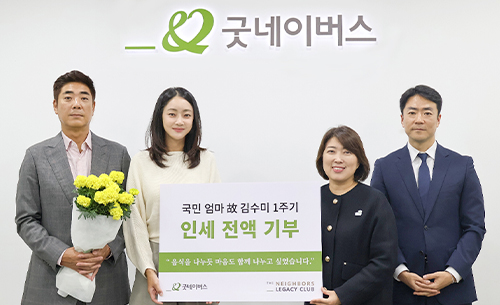 굿네이버스 소식 굿네이버스의 다양한 소식을 전달합니다. 더보기버튼 국내 故김수미 배우 별세 1주기 맞아 추모 기부금 전달 국내 '굿네이버스 레이스 with 띵크어스' 기부 러닝대회 성료 국내 우리 단체, 랄프 로렌 코리아와 국내 취약계층 아동을 위한 물품 전달식 진행 국내 우리 단체, 현대자동차그룹과 함께 아동학대 예방을 위한 ‘아이케어(i CARE)’ 사업 업무협약 체결 국내 우리 단체, (주)FRH와 국내 결식아동 지원 위한 후원금 전달식 진행