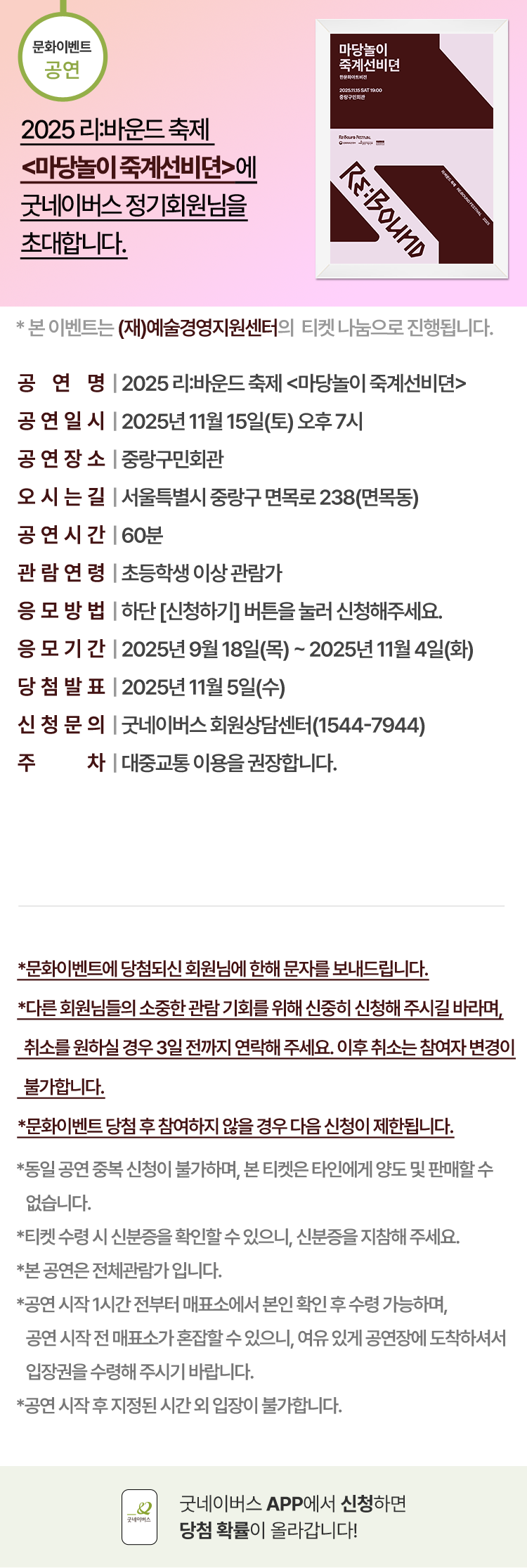 · 수집주체 | 사단법인 굿네이버스 인터내셔날 · 이용기간 | 해당 문화이벤트 종료 시까지 · 수집대상 | 문화이벤트 신청자 대상 · 수집목적 | 이벤트 참여 및 선정 / 당첨자 리스트 확인 · 처리항목 | 회원명 / 생년월일 / 휴대전화 *귀하는 개인정보 수집 및 이용 동의에 대한 거부 권리가 있으나, |