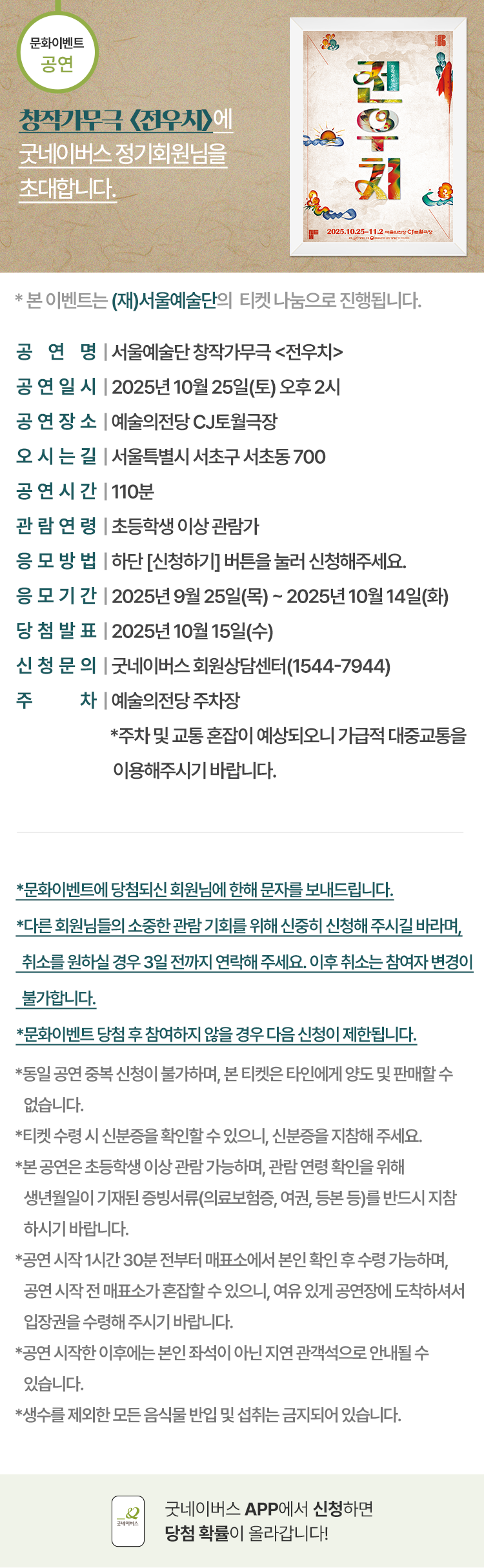 · 수집주체 | 사단법인 굿네이버스 인터내셔날 · 이용기간 | 해당 문화이벤트 종료 시까지 · 수집대상 | 문화이벤트 신청자 대상 · 수집목적 | 이벤트 참여 및 선정 / 당첨자 리스트 확인 · 처리항목 | 회원명 / 생년월일 / 휴대전화 *귀하는 개인정보 수집 및 이용 동의에 대한 거부 권리가 있으나, |