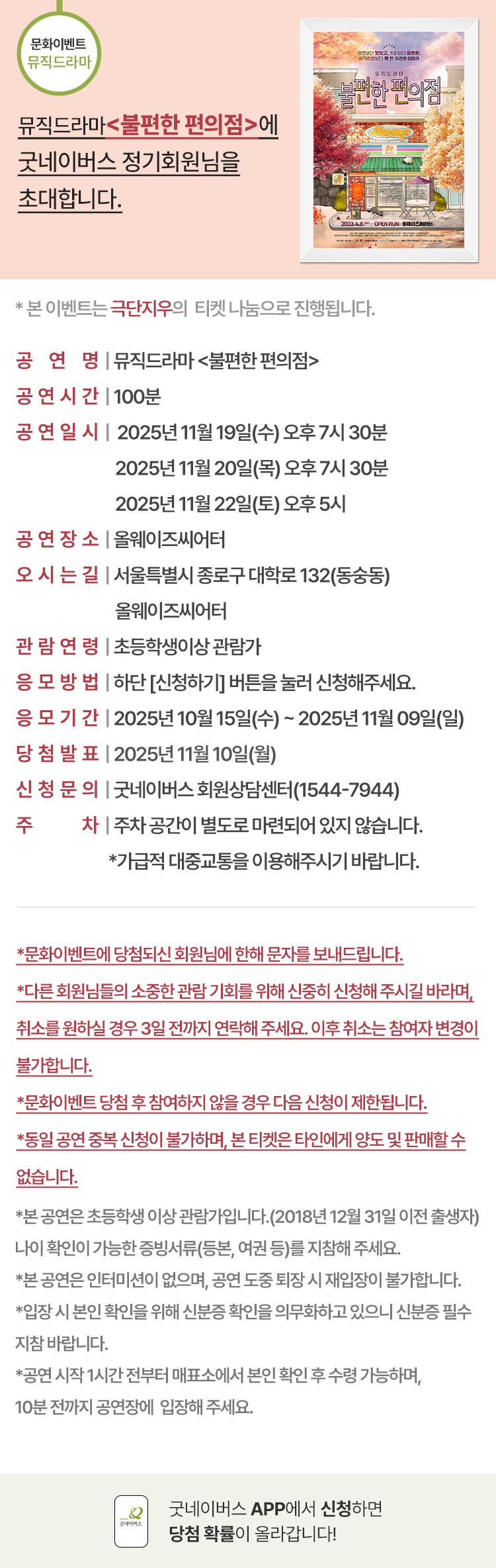 · 수집주체 | 사단법인 굿네이버스 인터내셔날 · 이용기간 | 해당 문화이벤트 종료 시까지 · 수집대상 | 문화이벤트 신청자 대상 · 수집목적 | 이벤트 참여 및 선정 / 당첨자 리스트 확인 · 처리항목 | 회원명 / 생년월일 / 휴대전화 *귀하는 개인정보 수집 및 이용 동의에 대한 거부 권리가 있으나, |