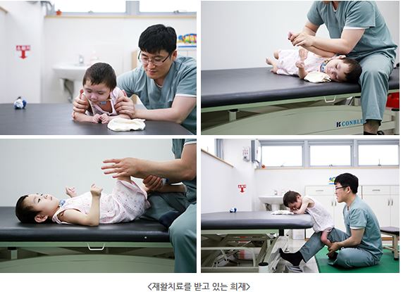 현재는 주 1~2회 재활치료를 받고 있습니다. 항상 누워있는 희재는 온 몸에 근육이 부족해 뼈가 탈골되거나 골절되기 쉽습니다. 때문에 뼈가 성장할 때에 근육이 조금이라도 따라갈 수 있도록 치료를 받고 있습니다.