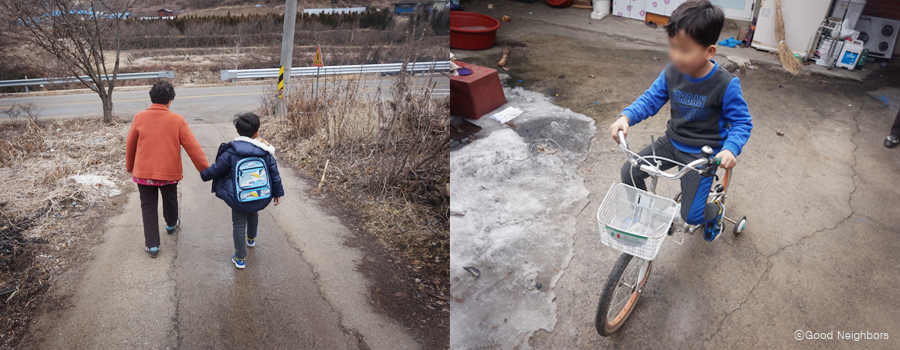 <사진 – 좌) 학교에 다녀오는 세진이, 우) 자전거 타며 즐거워하는 세진이 모습>