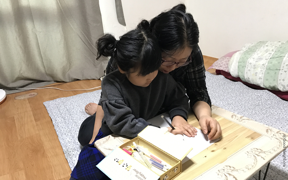 <사진 – 유치원에서 돌아온 민서의 공부를 봐주는 엄마>