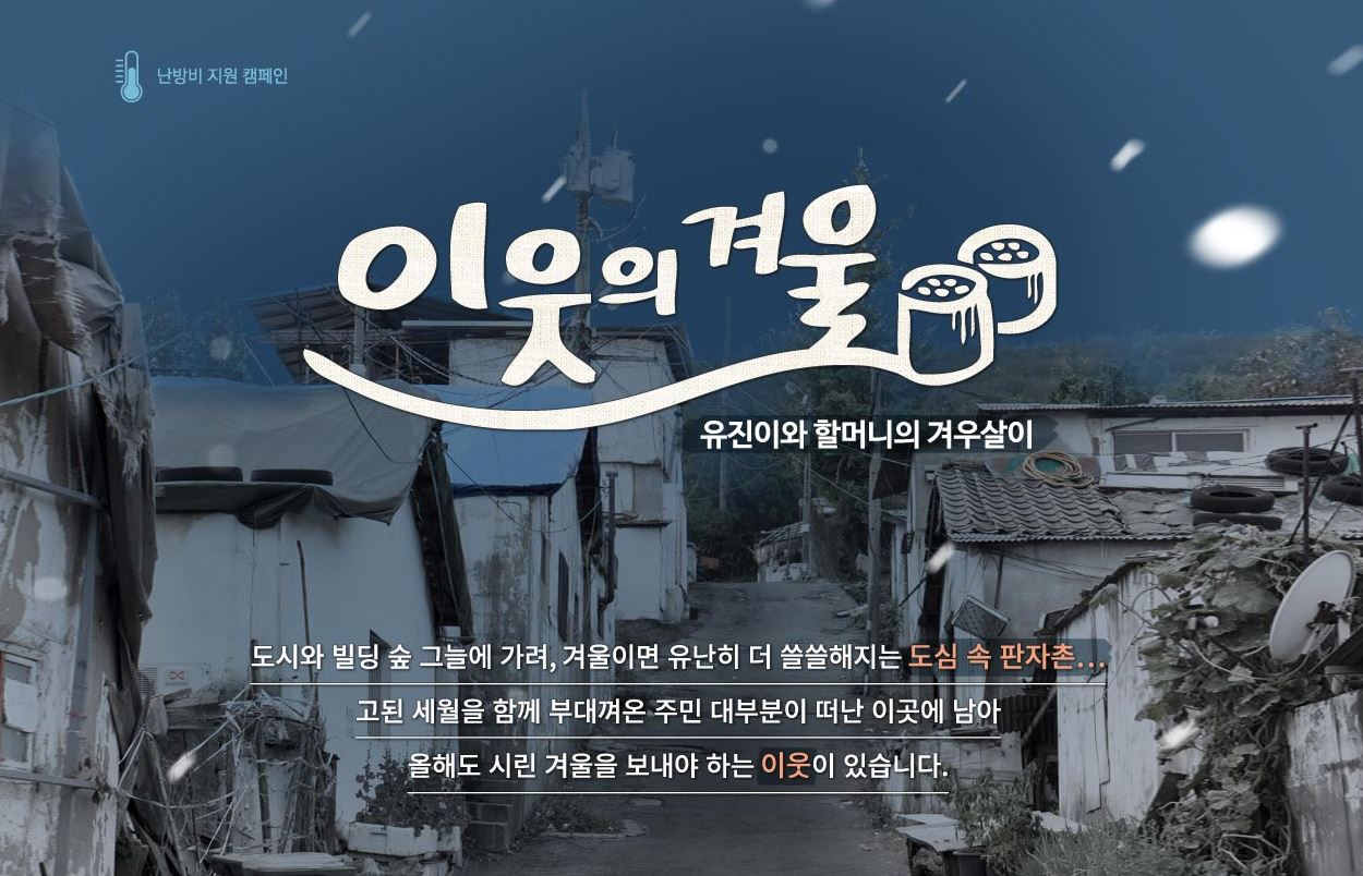 여름이면 폭염과 싸워야 하고, 겨울이면 벽에서도 칼바람이 스미던 판자촌 골목길의 끝 집에서 유진이와 할머니는 열 번째 겨울을 맞았습니다. 보증금 100만원에 월세 20만원의 집은 10년 전부터 바닥 난방만 간신히 돌아가던 상황... 한 겨울에도 찬물로 설거지와 빨래를 하는 할머니는 본인을 위해서는 가스 불 한번 켜지 않고 생활하면서도 가을 겨울이면 아침저녁으로 물을 데워가며 유진이를 씻겨왔습니다.