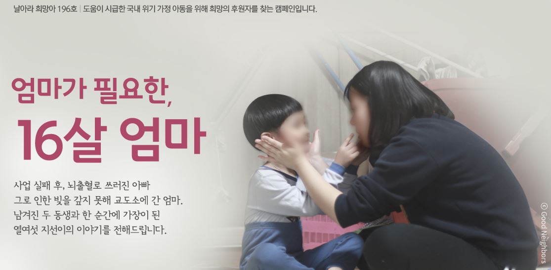 사업 실패 후, 뇌출혈로 쓰러진 아빠와 그로 인한 빚을 갚지 못해 교도소에 간 엄마를 대신해 남겨진 두 동생들과 한 순간에 가장이 되었던 열여섯 지선이. 갑작스럽게 무너진 가정상황 앞에 홀로 모든 것을 감당하고 있던 지선이를 위한 캠페인을 시작했고, 많은 후원자분들이 희망을 선물해주셨습니다.
