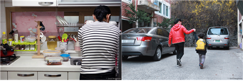 <좌-아이들을 위해 저녁 상을 준비하는 엄마, 우-어린이집 하원하는 지후를 데려오는 엄마>