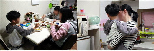 <좌-엄마와 함께하는 저녁 밥상, 우-엄마에게 어리광을 부리는 막내 지후>
