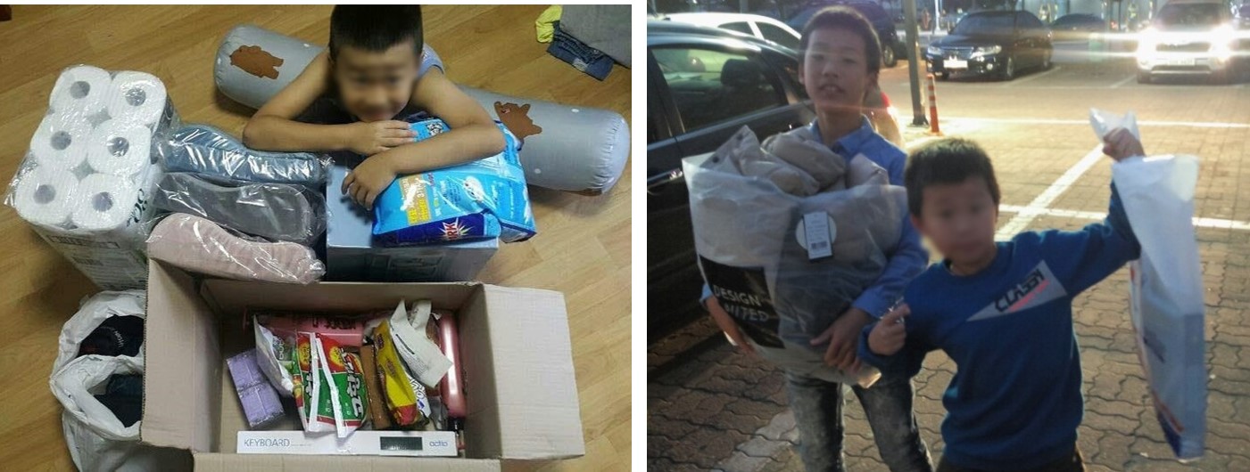 [사진2] 은호네 가정에 지원된 생필품 및 식료품과 은호와 동생에게 지원된 의류 및 학용품, 놀이용품