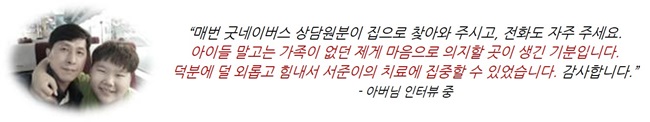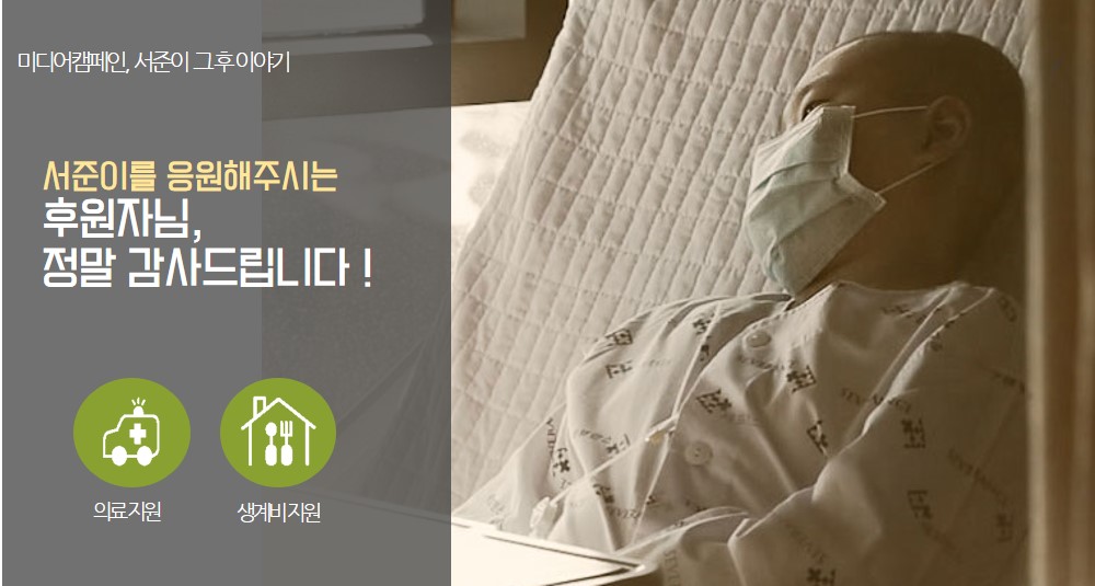 홀로 두 아이를 키우는 아버님은 병원과 집에서 각자 외롭게 하루하루를 보내는 아이들을 볼 때마다 근심과 걱정에 먹먹한 마음뿐이었습니다. 서준이의 이야기가 소개된 후 많은 분들이 보내주신 따뜻한 관심과 응원에 서준이네 가족이 감사 인사와 함께 지속적으로 치료를 받고 있는 서준이의 근황을 전해왔습니다.
