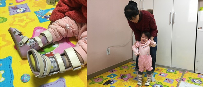 [사진1](좌) 의료보조기구 착용 모습 (우) 걸음마 연습 중인 은희