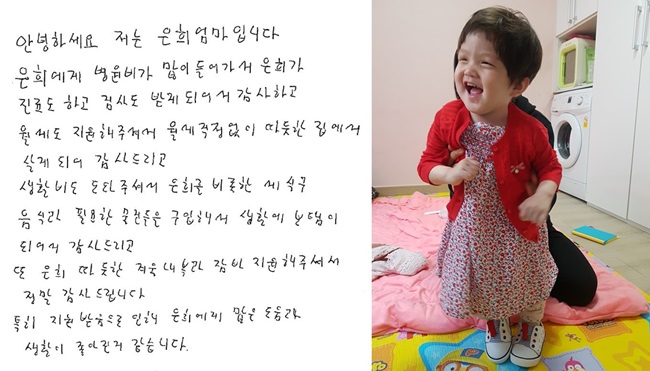 [사진4] (좌) 은희엄마의 감사편지 (우) 선물받은 새 옷을 입은 은희