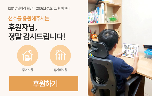 부모의 이혼 후 아빠와 단둘이 살던 선호는 아버지의 계속되는 학대를 피해 200km를 달려 엄마에게 돌아왔습니다. 하지만 넉넉지 않았던 형편 탓에 엄마와 선호는 얇은 대문 사이로 찬바람이 들어오는 1.5평의 쪽방에서 추운 겨울을 보낼 수밖에 없었습니다. 지난해 겨울, 선호의 사연이 소개된 후 많은 분의 따뜻한 응원과 사랑의 손길이 모여졌습니다. 따뜻한 보금자리로 이사한 선호의 가족이 감사의 인사를 전해왔습니다.