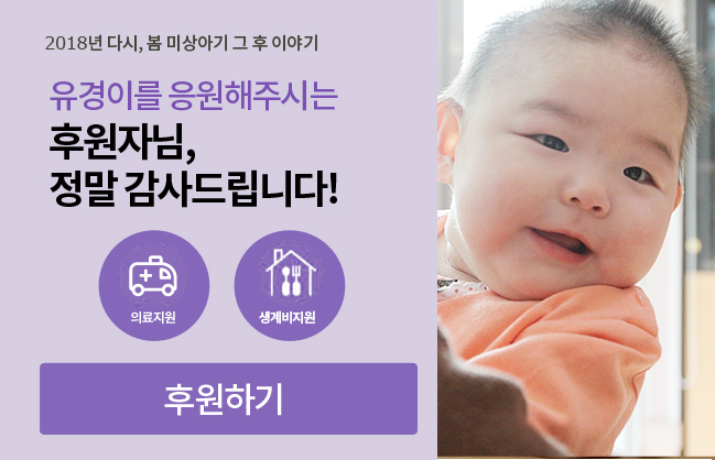 올해 봄 캠페인을 통해 유경이의 소식이 알려지면서 많은 후원자님들이 도움을 주시어 지금까지 발생한 병원비를 해결할 수 있었습니다. 또한, 유경이의 출생신고가 진행되면서 의료보험이 적용되어 유경이 앞으로 발생한 병원비도 걱정을 많이 덜 수 있습니다. 게다가 유경이의 사정을 잘 알고 있는 병원에서도 유경이를 정성껏 보살펴주었고, 후원금을 지원해준 덕분에 병원비 부담도 줄었습니다.