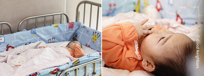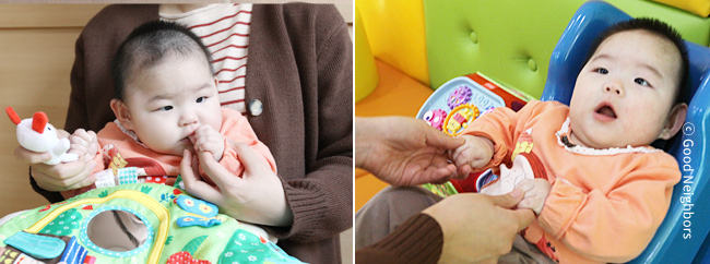처음 후원자님들에게 소식을 전해드렸던 8개월 전에 비해 유경이는 많이 건강해진 모습을 보이고 있지만 태어나면서 발생한 뇌 손상으로 인해 안타깝게도 장애판정은 불가피할 것으로 보입니다. 벌써 유경이가 태어난 지 11개월에 접어들었지만 인지발달은 1개월 수준, 소근육 발달은 4개월 수준에 그쳐있습니다.