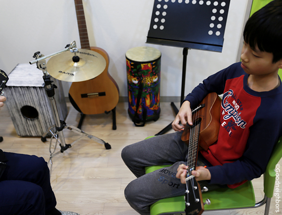 <지웅이가 음악상담치료를 받고 있습니다. 기타를 든 지웅이의 표정이 사뭇 진지합니다.>