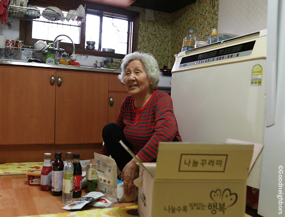 < 할머니가 생필품이 든 선물 꾸러미를 하나씩 꺼내보면서 웃습니다.>