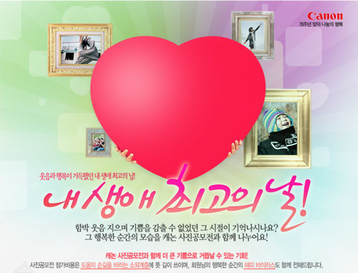 우리단체는 5월 8일부터 6월 7일까지 캐논코리아컨슈머이미징(주)(대표 강동환)과 함께 “내 생애 최고의 날”온라인 사진공모전을 진행합니다.