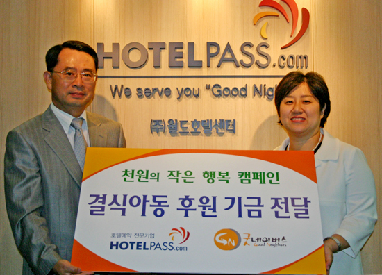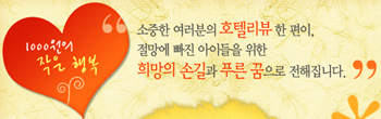 2007년 5월부터 (주)월드호텔센터가 굿네이버스와 함께 진행해오고 있는 [천원의 작은 행복]은, (주)월드호텔센터를 통해 여행을 다녀온 회원이 홈페이지(www.hotelpass.com)에 호텔리뷰(후기)를 남기면 (주)월드호텔센터에서 1개의 리뷰 당 1,000원의 기금을 적립하여 우리단체 결식아동 지원을 위해 기부하는 캠페인입니다.