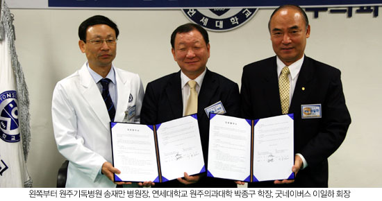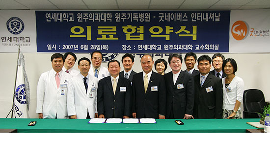 의료협약에 대한 협약식은 지난 6월 28일 11시 원주의과대학 의학관 세미나실에서 개최되었으며 연세대학교 원주의과대학 박종구 학장, 원주기독병원 송재만 병원장, 우리단체 이일하 회장 및 두 기관의 주요 인사들도 참석했습니다.