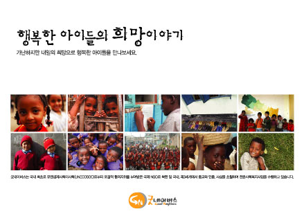굿네이버스 케냐 나이로비 고로고쵸 사업장의 ‘지라니어린이합창단’. 희망을 노래하는 지라니어린이합창단이 현재 한국에서 내한공연을 하면서 희망의 메신저 역할을 톡톡히 하고 있습니다. 굿네이버스는 지라니어린이합창단의 지속적이고 안정적인 활동을 위한 기금마련을 위하여 '희망의 나라 아프리카'를 주제로 사진작가 이요셉 님이 제작한 달력과 제3세계 아이들 사진으로 구성된 사진 엽서 세트, 해맑은 아이들의 모습을 담은 머그잔과 노트 그리고 지라니어린이합창단의 감동을 지속적으로 간직할 수 있는 핸드폰줄, 총 5가지 기부상품을 제작하였습니다. 기부상품은 지라니어린이합창단 공연 장소에서 판매하고 있으며 온라인으로는 우리단체가 운영하는 기부쇼핑몰인 오렌지존(http://www.orangezone.kr)에서 판매하고 있습니다. 기부상품을 통한 기금은 지라니어린이합창단이 더욱 활발한 활동을 할 수 있도록 지원되는 사업기금으로 사용되오니 많은 관심과 참여를 부탁드립니다. 1. 2008년에 함께할 아프리카 달력 7,000원 2. 아이들의 희망을 엿볼수 있는 사진 엽서 SET 5,000원 3. 보기만해도 행복해지는 머그컵 5,000원 |