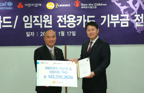 KB국민은행(은행장 강정원)은 1월 17일 우리단체에 포인트리카드기금 1억4천3백여만원을 기탁하였습니다.