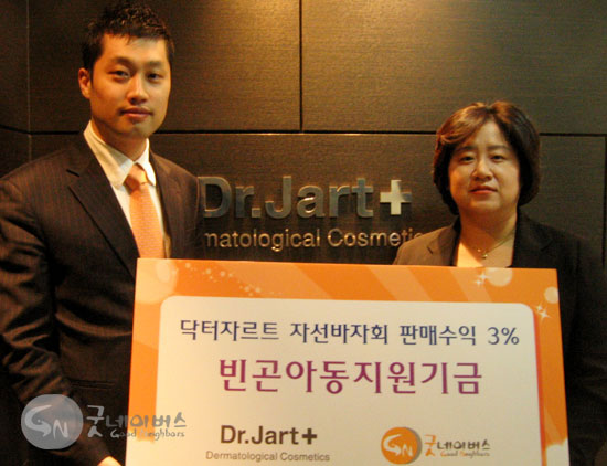 닥터자르트는 지난해 12월부터 1개월간 자체 쇼핑몰과 GSeshop 등에서 일부 베스트 상품을 50% 할인 판매하였습니다. 이 연말 바자 이벤트를 통해 발생한 총 수익금의 3%를 빈곤아동기금으로 조성하여 우리단체에 전달하였습니다.
