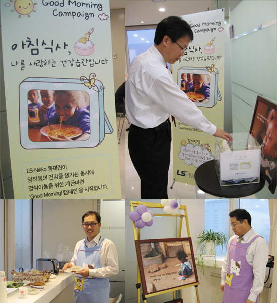 ‘Good Morning'캠페인이란, 회사에서 임직원들의 건강을 위해서 아침식사를 제공해주고 직원들은 아침식사비를 결식아동을 위해 기부함으로써 직원들의 건강도 챙기고 결식아동을 위한 기금도 마련할 수 있는 착한 캠페인입니다.