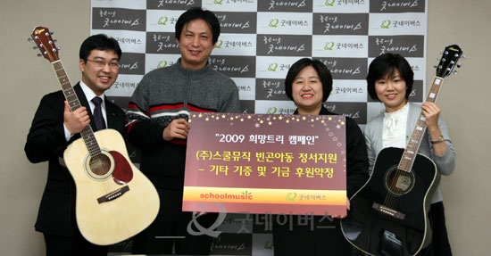 인터넷 악기 쇼핑몰과 교육 컨텐츠를 운영하고 있는 악기 전문기업인 (주)스쿨뮤직(www.schoolmusic.co.kr)에서는 2008년 12월부터 2009년 1월 까지 기타 1대가 판매될 때마다 기금을 1,000원씩 적립하여 우리단체에 후원할 예정입니다. 앞으로 적립될 기금은 우리단체에서 지원하고 있는 저소득가정 아동들을 위해 사용될 것입니다.