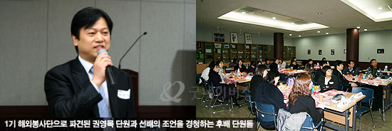 이날 모인 단원들은 타국에서 1~2년간 생활하며 어려웠던 점을 극복하며 느끼는 보람과 성취감을 나누는 시간과 함께 현지에서 겪었던 다양한 에피소드를 함께 나누며 즐거운 시간을 보냈습니다. 특히 해외봉사단 1기로 파견되었던 권영목 단원이 이날 행사에 참석하여 후배 단원들에게 도움이 될만한 다양한 이야기를 해 주었습니다.