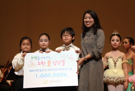 노원폴앙상불은 초등학교 2학년부터 중학교 2학년까지의 아동, 청소년들과 유럽 등지에서 수학한 연주자들로 구성된 단체로서 많은 시간 흘린 땀과 노력의 결실인 ‘희망예술제’를 통해 이웃들을 위한 사랑 나눔에 앞장서 왔으며, 올해에는 우리 단체와 함께 해외빈곤아동들을 위하여 공연 수익금의 일부(1백 만 원)를 후원하고 캄보디아, 몽골에 살고 있는 세 명의 아동들과 아동결연을 함께 맺었습니다.