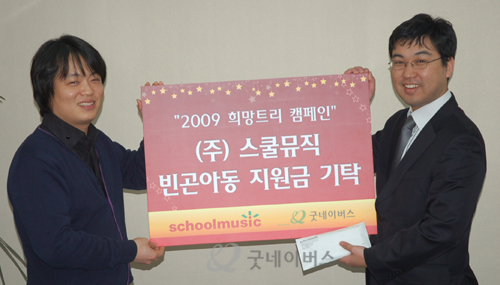 인터넷 악기 쇼핑몰과 교육 컨텐츠를 운영하고 있는 국내1위 온라인악기 쇼핑몰인 (주)스쿨뮤직(www.schoolmusic.co.kr)에서는 지난 2008년 12월부터 2009년 1월 까지 기타 1대가 판매될 때마다 기금을 1,000원씩 적립하여 후원해 주셨습니다. 후원해 주신 기금은 저소득가정 아동들을 위해 사용될 예정입니다.