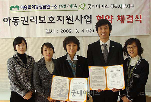 우리단체 경북서부지부(지부장 안정하)는 지난 3월 4일(수) ‘이승희아동상담연구소 부모랑아이마음(소장 이승희)’과 아동권리보호지원사업 협약을 체결하였습니다. ‘이승희아동상담연구소 부모랑아이마음’은 상담․치료의 전문성으로 우리단체의 아동권리교육사업에 협력하여 지역사회 아동의 권리보호와 증진을 위해 적극적으로 지원할 것을 약속하였습니다. 이번 협약식을 통해 앞으로 지역사회 아동들이 더욱 밝고 건강하게 자라길 기대해 봅니다. 앞으로도 많은 관심 부탁드립니다. 카카오링크 url 이전글이동 목록 다음글로이동