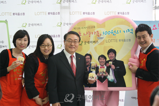 우리단체는 지난 20일(금) 가족나눔교육 미소가 프로젝트의 일환인 "지구촌 나눔 가족 100원의 기적" 행사에 롯데홈쇼핑 임직원과 함께 목동사옥에서 저금통 행사를 진행 하였습니다. 올해로 17회를 맞는 굿네이버스 세계시민교육 ‘100원의 기적’은 2008년부터 롯데홈쇼핑의 후원으로 굿네이버스와 함께 진행되고 있습니다. 이번 행사는 롯데홈쇼핑 임직원에게 가난으로 고통 받는 지구촌 아이들에게 희망을 주고자하는 100원의 기적의 의미를 알리고, ‘100원의 기적 저금통’을 나누어 주어 일상의 작은 나눔이 모여 큰 나눔으로 전환 될 수 있음을 알리는 뜻 깊은 시간이 되었습니다.
