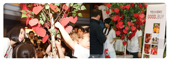 우리단체는 착한소비캠페인 GOOD_BUY의 본격적인 시작을 알리기 위해 5월 12일(화), 런칭 행사를 개최하였습니다. 본 행사에서는 소니에릭슨 광고 모델인 이민정과 굿네이버스 서포터즈인 어린이 공연팀 예쁘제의 ‘멋진 친구들’이 참석하여 시민들을 대상으로 착한소비의 다양한 참여 방법을 알리고, 착한소비자 되기 서명, 빈곤아동에게 보내는 희망 메시지 달기, 예쁘제 ‘멋진 친구들’의 나눔 공연으로 다채로운 캠페인을 펼쳤습니다. 특히, 특수 제작된 가로*세로 1.5m의 대형 상자 안에 들어있는 색색의 하트 중 착한 소비를 상징하는 ‘빨간 하트’를 찾는 이벤트를 통해 ‘착한소비’ 가상 경험도 제공하였습니다.