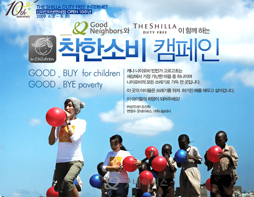 신라인터넷면세점(www.dfsshilla.com)에서 고객이 $200 이상 구입할 경우 수익금의 1%를 굿네이버스 해외사업장 지원을 위해 기부하는 '착한 소비 캠페인'이 진행되며, 물품을 구매한 모든 고객에게는 에코백을 선물로 드립니다. 또한 'Wedding Fair이벤트'에서 행복한 날을 어려운 이웃과 함께하는 '내생에 최고의 날 캠페인'도 진행되고 있으며, 캠페인에 참여한 분들께는 나눔증서를 보내드립니다.