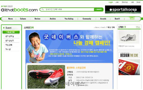 우리단체는 지난 7월 6일(월)부터 축구 전문 미디어 스포탈코리아에서 운영하는 ‘올댓부츠’사이트(www.allthatboots.com)에서 ‘나눔 경매 캠페인’을 진행하고 있습니다. 스포탈코리아에서는 국내의 미출시 축구화 및 유명 축구화를 온라인 경매를 통해 판매할 예정이며 경매를 통해 모여진 수익금 전체를 빈곤가정아동을 위한 전문사회복지사업비로 기부합니다. 즐거운 나눔 경매에 많은 참여 부탁드립니다. 나눔의 장을 열어주신 스포탈코리아 임직원 여러분께 진심으로 감사드립니다. 카카오링크 url 이전글이동 목록 다음글로이동