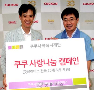 우리단체는 지난 6월부터 쿠쿠홈시스(대표 구본학)가 설립한 쿠쿠사회복지재단과 함께 저소득가정의 결식아동들에게 밥솥과 쌀을 제공하는 '클릭 한번으로 이루는 사랑나눔 실천' 캠페인을 쿠쿠홈시스 홈페이지 내 커뮤니티에서 진행하였습니다. 기탁식은 8월14일 부산동부지부에서 가졌으며, 굿네이버스 전국 25개의 지역아동센터와 쉼터의 아동들에게 밥솥과 한 달 분량의 쌀을 지원하였습니다. 사랑나눔캠페인을 통해 저소득가정의 결식아동들에게 사랑을 전해주신 쿠쿠홈시스 임직원분들께 감사드립니다. 카카오링크 url 이전글이동 목록 다음글로이동