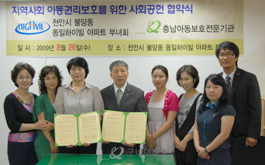 우리단체 충남아동보호전문기관(관장 신범수)은 학대피해아동 및 결식아동들의 건강한 성장과 발달을 도모하기 위해 8월 26일(수) 천안시 불당동 동일하이빌 아파트 부녀회(회장 임성남)와 사회공헌 협약을 체결하였습니다. 본 사회공헌 협약의 주요내용으로는 천안시 불당동 동일하이빌 아파트 부녀회의 학대피해아동 및 결식아동지원사업을 위한 홍보, 캠페인 및 바자회 장소협조, 자원봉사자 활동, 기부금 지원 등이 있습니다. 이번 협약을 통해 앞으로 지역사회주민과의 유기적 협력관계를 확립하고 위기에 처한 지역사회내의 학대피해아동과 결식아동들을 위한 지원이 활발하게 이루어지길 기대합니다. 카카오링크 url 이전글이동 목록 다음글로이동