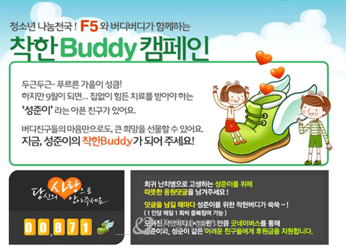 이번 캠페인은 '마음을 나누는 것이 기부의 시작이다.'는 컨셉으로 공동기획되었으며, 버디버디 청소년회원들이 댓글응원을 남길 때 마다 난치병 아동을 위한 후원금이 적립되는 방식으로 진행하고 있습니다. 캠페인을 통해 기부에 대한 청소년들의 마음의 장벽을 낮추고, 자연스럽게 나눔을 실천하도록 돕는데 그 목적을 두고 있으며, 캠페인페이지에는 난치병 아동에게 희망을 잃지 말라는 청소년 회원들의 응원메세지가 줄잇고 있습니다.