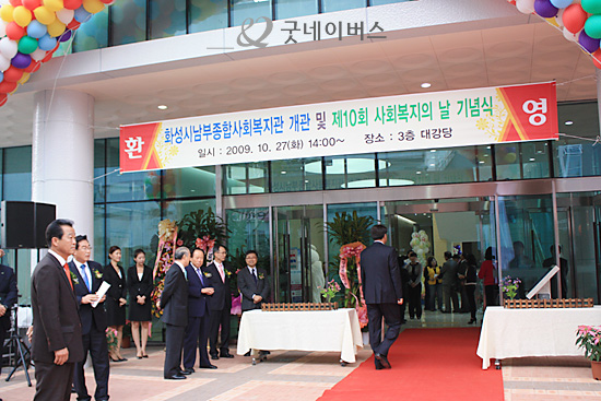 우리단체는 10월 27일 화성시남부종합사회복지관의 개관식을 진행하였습니다. 본 개관식에는 이일하 본 법인 회장을 비롯하여 최영근 화성시장, 이근홍 화성시사회복지협의회 회장 과 지역 유관기관 단체 및 지역주민들이 함께하였습니다. 이날 개관식은 사회복지의 날 기념식과 함께 진행되었으며 야외사물놀이공연을 시작으로 현판제막식과 축사, 외부초청 공연, 나눔강연으로 진행되었습니다.