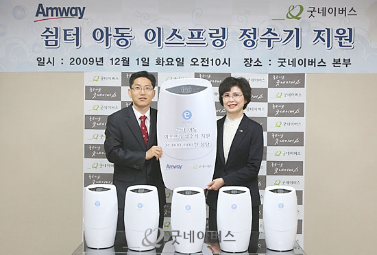 우리단체는 지난 12월 1일(화)에 한국암웨이(대표이사 박세준, www.amwaykorea.co.kr)로부터 암웨이 이스프링 정수기를 후원받았습니다. 금번에 후원받은 정수기는 우리단체에서 운영하는 전국 10개 쉼터에 각 1대씩 설치되며, 향후 5년간 정기적인 방문을 통한 필터교환 및 정수기 세척 등의 사후 관리도 함께 이루어질 예정입니다.