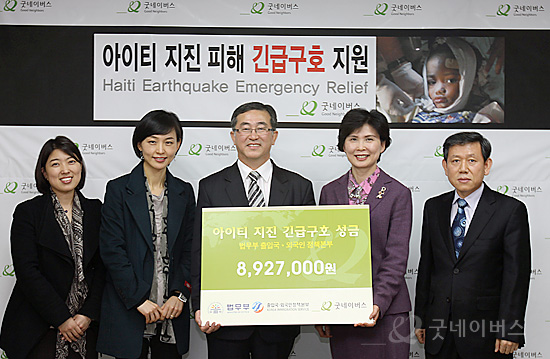 이 성금은 법무부 출입국∙외국인정책본부와 전국의 소속기관 직원 1,700여 명이 아이티 참사소식을 접하고 자율적으로 참여하여 18일(월) 하루 만에 조성되었습니다.