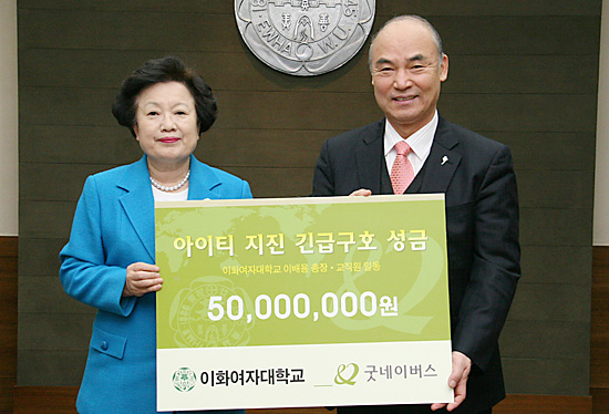 이화여자대학교 이배용 총장과 교직원 일동은 대규모 지진으로 큰 피해를 입은 아이티의 재난 복구 및 재해민 구호를 위해 지난 1월 19일(화), 우리단체에 5천 만원의 성금을 전달하였습니다.