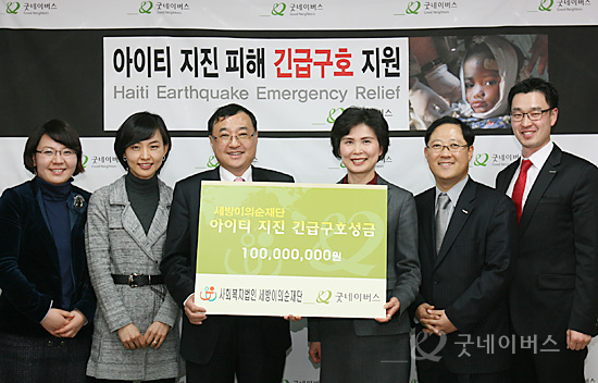 세방이의순재단은 대규모 지진으로 큰 피해를 입은 아이티의 재난 복구 및 재해민 구호를 위해 지난 2월 2일(화), 우리 단체에 1억 원의 성금을 전달하였습니다. 전달받은 기금은 아이티 지역의 학교피해지역을 중심으로 식수, 의약품, 식량 등의 구호품을 전달하는 데 사용할 예정입니다.