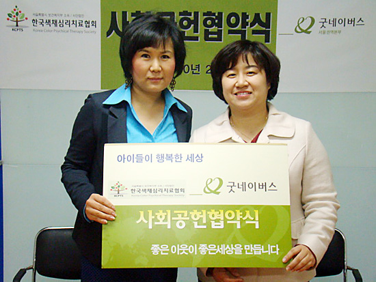 굿네이버스 서울권역본부(본부장 : 홍선교)에서는 2010년 2월 5일(금), 한국색채심리치료협회(대표이사 : 김성자)와 함께 상호협력을 바탕으로 학대피해아동과 소외된 아동 가정을 지원하여 행복한 가정을 만들기 위해 사회공헌협약을 체결했습니다.