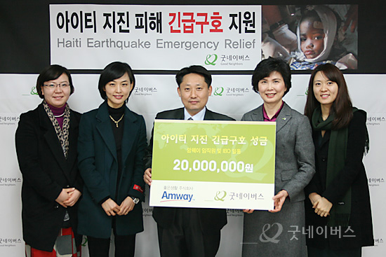 한국암웨이(대표 박세준)는 대규모 지진으로 큰 피해를 입은 아이티의 재난 복구 및 재해민 구호를 위해 지난 2월 12일(금), 우리 단체에 2,000만원의 성금을 전달하였습니다. 전달받은 기금은 아이티 지역의 학교피해지역을 중심으로 식수, 의약품, 식량 등의 구호품을 전달하는 데 사용할 예정입니다.