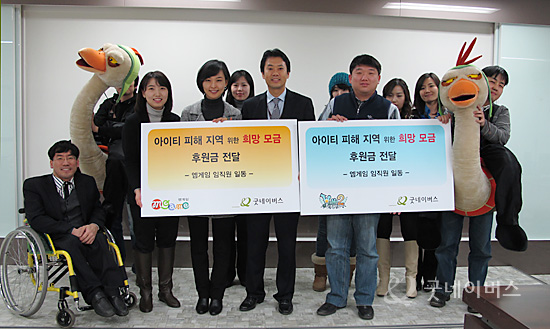 우리단체에서는 지난 2월 2일(화) 글로벌 게임 포털 엠게임(www.mgame.com, 대표 권이형)으로부터 지진 피해로 어려움을 겪고 있는 아이티 복구를 돕기 위해 엠게임 임직원 및 게임 회원들이 마련한 성금을 전달받았습니다.