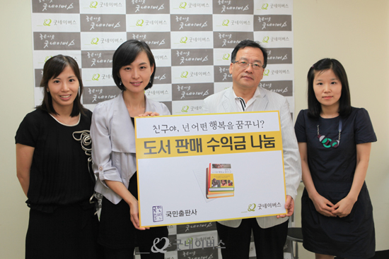 국민출판사는 지난 해 우리단체와 공동기획으로 ‘친구야, 넌 어떤 행복을 꿈꾸니?’를 발간하며 도서 판매 수익금 3%를 우리단체에 기부하여 해외의 어려운 어린이들을 돕는데 사용하겠다고 약정한 바 있습니다. 이번 기금은 굿네이버스의 해외 23개 사업국을 통하여 해외구호개발사업에 사용될 예정입니다.
