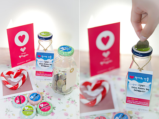 천사데이 키트는 이미 나눔을 실천하였다는 의미의 하트모양 나눔사탕과 유리병을 저금통으로 만들어 나눔에 참여하도록 도와주는 병뚜껑으로 구성되어 있습니다. 천사데이 키트 판매기금은 국내빈곤아동을 위해 사용될 예정입니다.